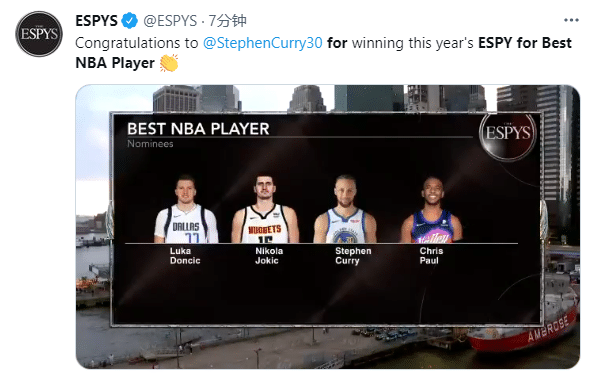 恭喜!库里荣获ESPY年度最佳球员奖,击败三大球星+比肩科比创纪录