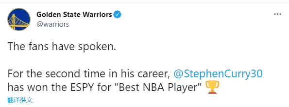 勇士官方第一时间恭喜库里,发推写道:球迷们可以发声了,这是库里职业生涯第二次荣获ESPY最佳球员大奖;恭喜库里,勇士 官方还发推:库里是2021年ESPY最佳球员得主吗?除了库里还能有谁。
