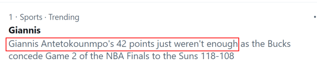字母哥这样的高分,也赢不下太阳,充分说明了总决赛不是高分就能赢球的舞台。数据网站StatMuse列出了过去7次总决赛40+表现。他们分别是2017年对勇士的詹姆斯、2018年对勇士的詹姆斯、2018年对骑士的杜兰特、2019年对猛龙的库里、2020年对湖人的巴特勒、2020年对热火的詹姆斯以及2021年对太阳的字母哥。