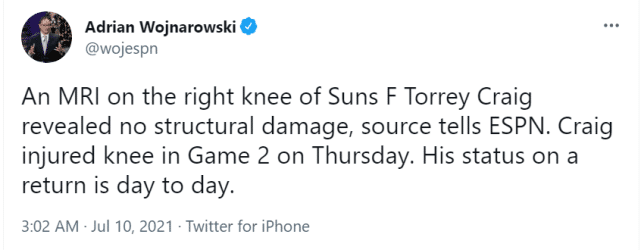 24直播网讯 北京时间7月10日,据名记沃纳罗斯基报道,太阳前锋克莱格的右膝核磁共振检查结果已经出炉。万幸他的膝盖没有结构性损伤,目前的状态是每日观察。