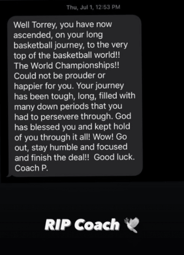 佩恩教练在短信上写道:“托雷(克莱格),在你漫长的篮球旅途中,现在你已经来到到篮球世界之巅!!总冠军!!为你感到无比骄傲和高兴。你的旅程充满艰辛,也很漫长,有过不少低谷期,但你都挺过来了。上帝保佑你,继续加油,保持谦逊的心,集中注意力并搞定这一切。好运,来自Coach P。”