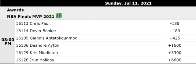 和G1赛前的赔率(下图)相比,保罗的优势缩小。他的赔率从-210变成-155,相比第一场比赛,保罗在第二场的数据略有下滑,布克发挥强势,这也帮助他不但超过字母哥,而且缩小了与保罗之间的差距。
