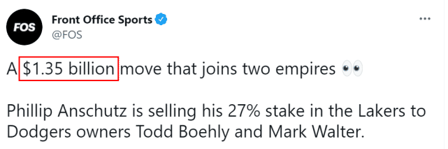 24直播网讯 北京时间7月10日,湖人官方网站发布消息,81岁的菲尔-安舒茨已经将他拥有的27%的湖人股份正式转让给马克-沃尔特和托德-伯利。这一消息在6月底被曝光,不过今天NBA董事会才正式批准了这笔交易,两位富豪成为了湖人的第二大股东。美媒报道称,湖人27%股份的转让价格是13.5亿美元。