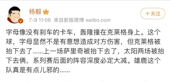 不过篮球评论员杨毅在评论克雷格的受伤时,他表示很显然字母哥并不是故意的,字母哥像没有刹车的卡车,轰隆撞在克雷格身上,但是这个球,字母哥显然并不是有意伤害对手的。但克雷格被抬下去了,上一场比赛萨里奇被抬下去了,系列赛后面阵容深度大减,雄鹿这个队真有点邪~