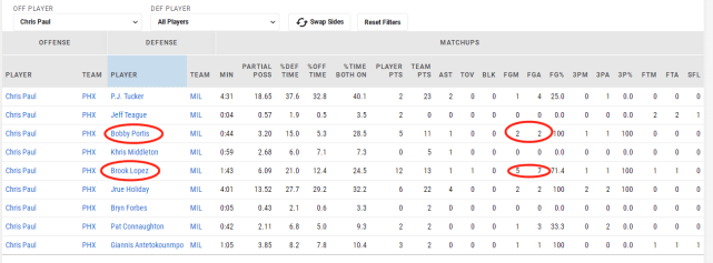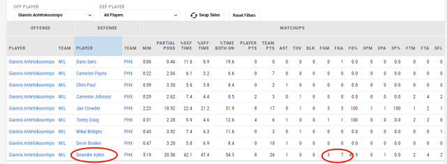 根据赛后的防守数据显示,本场比赛保罗面对雄鹿的两大中锋,9次出手命中7次,狠狠的打爆了他们的防守。太阳这边,艾顿拿下了准双20的数据还锁死了字母哥,本场后者面对太阳中锋仅有7投3中。