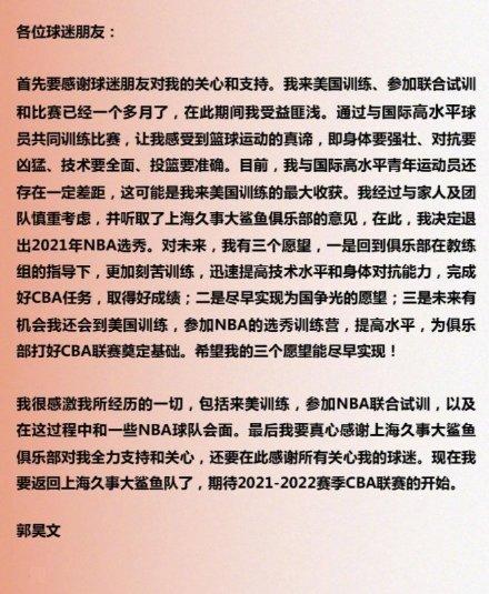 24直播网讯北京时间7月8日,郭昊文正式宣布退出NBA选秀,并且在个人社媒上发长文回顾了此次参加联合试训的经历,感受到了自己与NBA的差距!