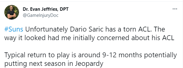 据医学专家Evan Jeffries分析,达里奥-萨里奇的前交叉韧带撕裂了;最让人担心的悲剧发生了,他的前交叉韧带 撕裂,具体的复出时间大约为 9-12 个月,下赛季可能会因伤无法出战;言外之意就是萨里奇因伤赛季报销,而且影响下赛季。