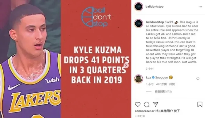 今日美媒balldontstop转发了库兹马19年对阵活塞三节砍下职业生涯最高41分的集锦,并配文说道:和詹眉合作牺牲自己成就队友,库兹马即将回归真我。