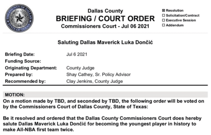 达拉斯县的法官及委员们批准了一项决议,宣布将今天作为当地的“卢卡-东契奇”日(当地时间7月6日)网友表示7月7日更适合作为东契奇的节日;而达拉斯媒体提醒道,在2016年7月7日,达拉斯当地曾发生过暴徒开枪打死5名警察的恶性事件。