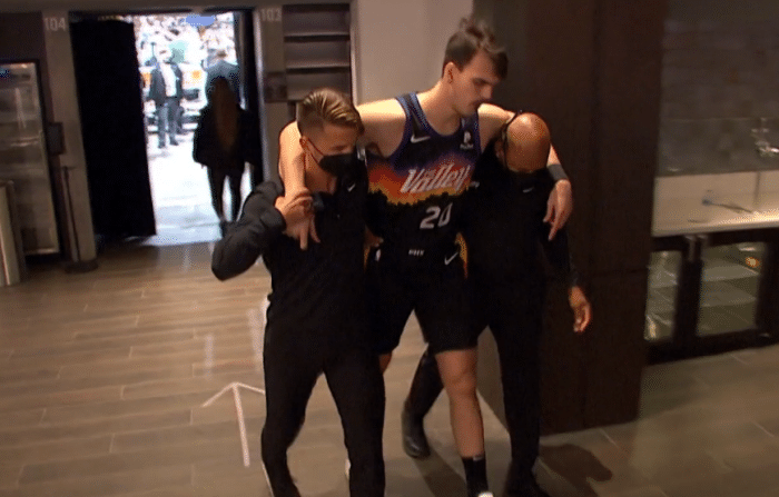 场上突然出现意外,上场之后发挥不错的萨里奇突然受伤,随后返回更衣室。在球员通道,萨里奇已经难以支撑,在两名工作人员的帮助下,才一瘸一拐走回更衣室。不过布克的表现非常出色,他连续得分。而克雷格也抢下前场板补篮得分。首节结束,太阳30-26领先。