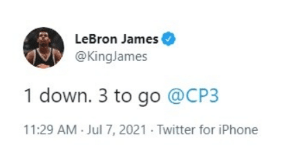 24直播网讯 北京时间7月7日,NBA总决赛首战太阳118-105轻松击败雄鹿,拿下开门红。此役,保罗成为太阳的头号功臣,他在第三节独得16分,率队拉开比分,成为球队取胜的关键。赛后,詹姆斯也发推盛赞兄弟:还差三场!