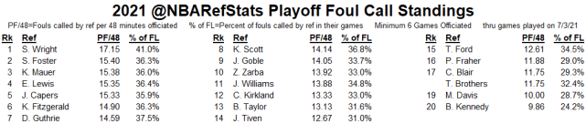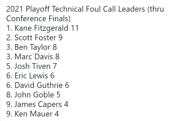 另据今年季后赛的技术犯吹罚数据,戴维斯吹过8次技犯,并列第三,吉文吹过7次技犯,排名第5,两人吹罚技犯的频率都很高。弗拉赫的吹技犯次数没有进入季后赛裁判的前十。