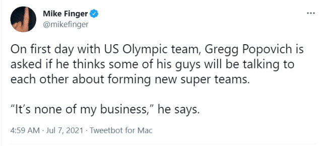 美国男篮公布的照片中,波波维奇还在场边和利拉德进行交流。这位开拓者球星也吸引了不少关注,毕竟,来到这次训练营前,外界报道称利拉德将成为美国男篮队友们竞相招募的对象。也有记者询问波波维奇,是否认为美国男篮的一些球员会讨论组建超级球队。波波维奇的回应也很干脆:“那不关我的事。”