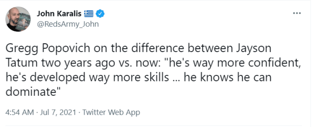波波维奇还聊到了塔图姆。过去两个赛季,塔图姆的进步巨大,波波维奇都看在眼里。“他变得更自信了,也开发出了更多的技能。他知道他可以统治球场。”不得不说,波波维奇对塔图姆的评价还是很高的。