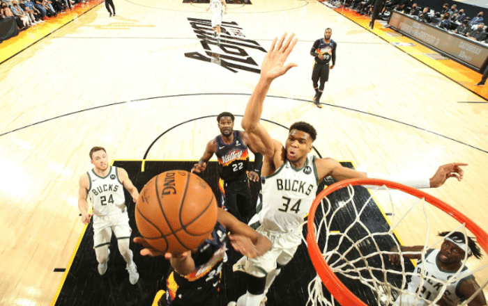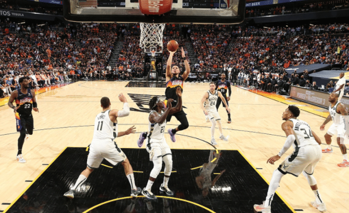 24直播网讯 北京时间7月7日,NBA总决赛拉开大幕,第一场比赛是在太阳主场进行,最终太阳全队6人得分上双,以118-105击败雄鹿,系列赛大比分1-0领先,同时还占据主场优势。这场比赛字母哥伤愈复出,大部分时间比赛的主动权都掌握在太阳手中,在保罗、布克和艾顿的带领下,太阳轻取雄鹿,拿下总决赛首胜。