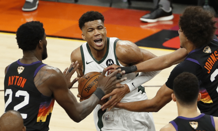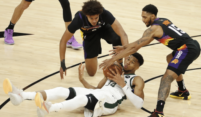 24直播网讯 北京时间7月7日,NBA总决赛在凤凰城拉开大幕,首战太阳以118-105击败雄鹿,系列赛大比分1-0领先。这场比赛太阳打得积极主动,他们全队有多达6人得分上双,其中三巨头合砍81分,包括了艾顿22分19篮板大号两双,保罗总决赛首秀就拿下32分9助攻,布克27分2篮板6助攻3断表现全面。雄鹿这边的字母哥虽然火线复出,砍下20分17篮板4助攻,但无奈的是他们还是遗憾的输球。