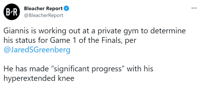 据前方记者报道,字母哥正在一个私人球馆进行秘密训练,球队将评估他能否出战总决赛首场比赛。他没有参加今天的媒体采访。消息源透露,字母哥的左膝过度伸展的伤势恢复,已经取得重大进展。