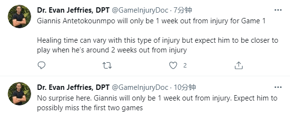 究竟字母哥何时才能重返赛场?据医学专家Evan Jeffries分析,字母哥受伤后才过一周,他将缺席总决赛G1,治疗时间可能会因伤病的不同发生变化,但字母哥至少需要两周才能更接近复出,预计他将缺席总决赛前两场比赛。