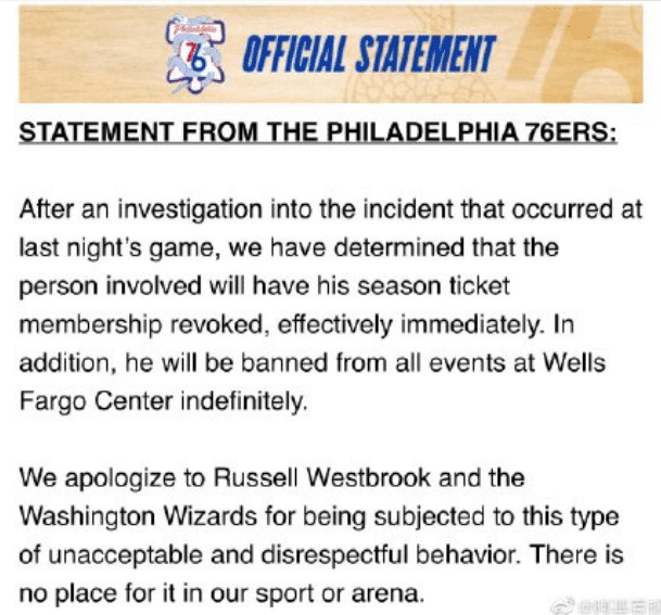 球迷也成为NBA季后赛的一个焦点,费城和奇才的比赛,威少离场的时候被球迷扔了爆米花,险些引发冲突,威少十分愤怒,球员也为威少鸣不平。最新的结果显示,费城官方找到了这位球迷,撤销了他的季票资格,禁止进入球馆以及参加球馆的所有活动。