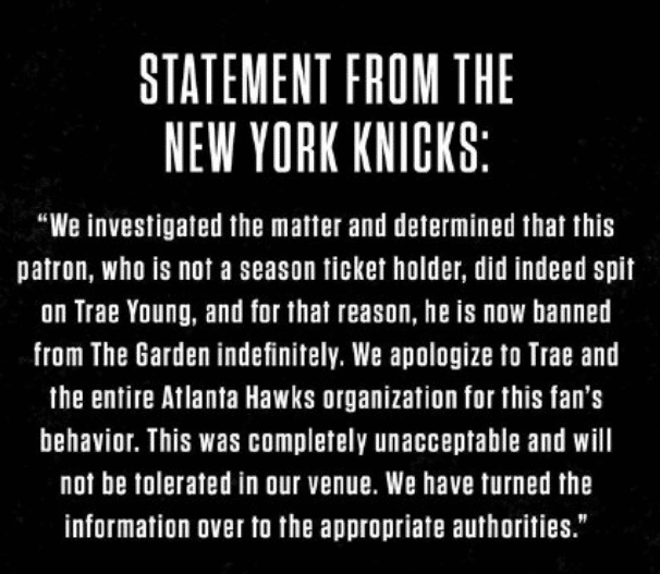 此外,尼克斯球迷对特雷杨吐痰一事也有了新的进展,尼克斯官方表示这位球迷并非季票持有者,做出无限期禁止这位球迷在尼克斯主场现场观赛的处罚。本赛季季后赛,球迷的入场让比赛有了更多看点,球员也面临更大压力,这或许也是比赛的一部分,但不要太越线。
