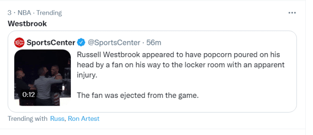 这一事件也引起热议,很快冲上热搜。詹姆斯显然看了这场比赛,发推力挺威少:“作为球员,我们想知道那个在威少伤退时冲他扔爆米花的人是谁!球馆各个位置都有摄像机,因此没有任何借口!请保护我们的球员。”