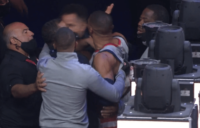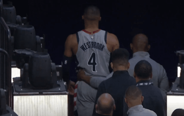 24直播网讯 北京时间5月27日,奇才客场95-120不敌费城,威少末节脚踝受伤退场,在离开球场前,有球迷把爆米花扔到威少头上,威少想要冲回球场和球迷理论,但被工作人员拦下。随后,这位球迷被驱逐出场。