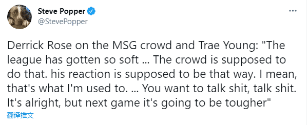 对于此前特雷杨和尼克斯球迷之间的隔空对话,罗斯表示这是他习惯的篮球比赛,现在的联盟太软了,特雷杨在客场打出一场了不起的比赛,这是球迷该有的反应,而特雷杨的做法是没问题的,G2现场氛围将会更加令人窒息