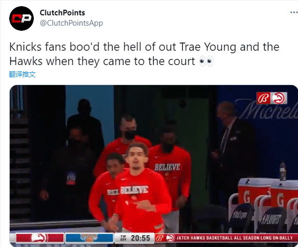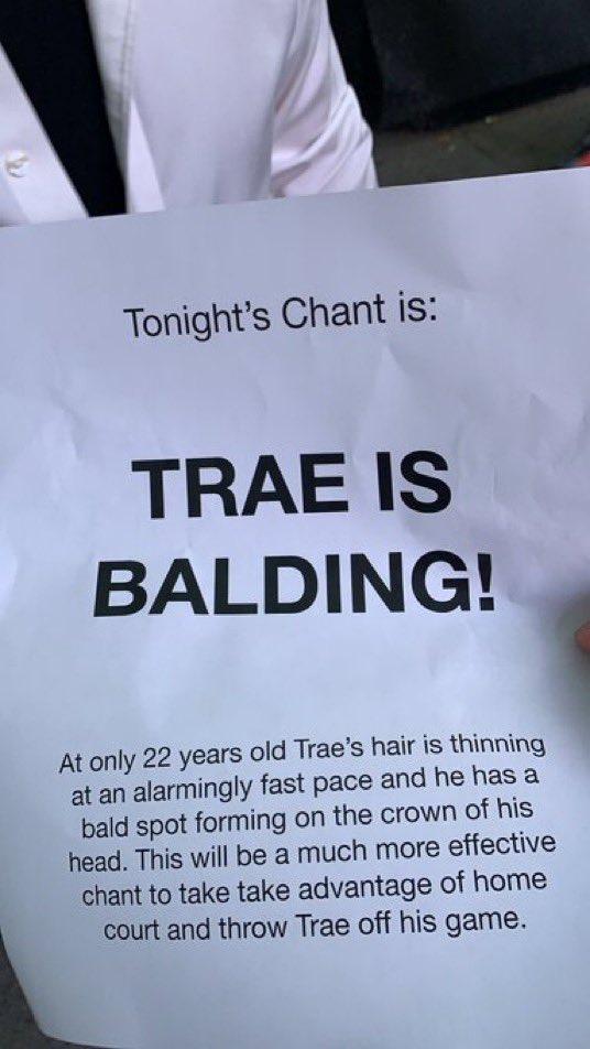 据Mike Vorkunov报道,麦迪逊花园球馆再次响起“Fxxk 特雷杨”谩骂声,当特雷杨跑进球场时,现场嘘声一片;尼克斯球迷高举“特雷杨秃顶”的标语,标语中还写着:特雷杨只有22岁,他的头发正在以惊人的速度变薄,他的头顶已经秃了。