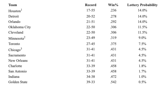 第1-14位:1.火箭(14.0%)、2.活塞(14.0%)、3.魔术(14.0%)、4.雷霆(11.5%)、5.骑士(11.5%)、6.森林狼(9.0%)、7.猛龙(7.5%)、8.公牛(4.5%)、9.国王(4.5%)、10.鹈鹕(4.5%)、11.黄蜂(1.8%)、12.马刺(1.7%)、13.步行者(1.0%)、14.勇士(0.5%)。