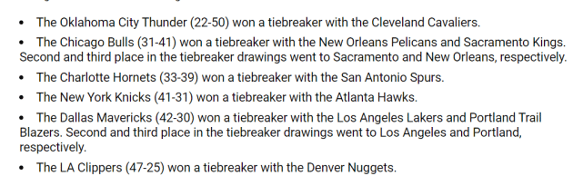 通过抛硬币,战绩同为22胜50负,雷霆排名第4,骑士排名第5;同为31胜41负,公牛排名第8,国王排名第9,鹈鹕排名第10;同为33胜39负,黄蜂排名第11,马刺排名第12;同为41胜31负,尼克斯排名第19,老鹰排名第20;同为42胜30负,独行侠排名第21,湖人排名第22,开拓者排名第23;同为47胜25负,快船排名第25,掘金排名第26。