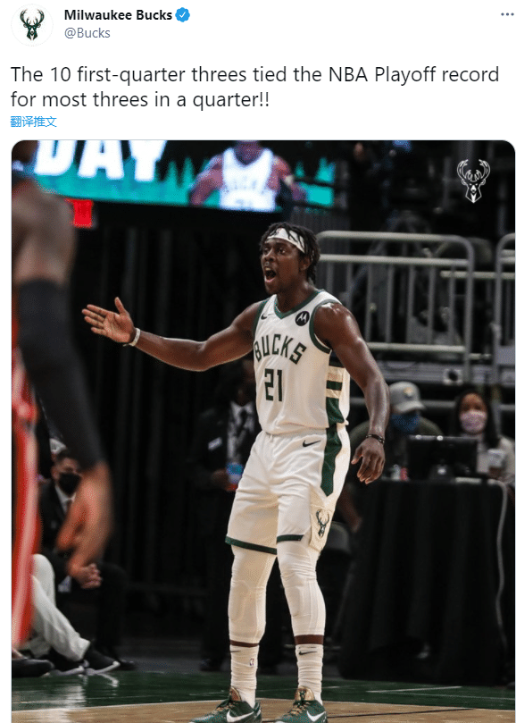 雄鹿首节投疯了,三分球15投10中太不可思议,命中率高达66%,首发五虎除了大洛佩兹之外,其他四人都投进一记三分球,福布斯和康诺顿两大替补单节投进6记三分;雄鹿单节10记三分追平NBA季后赛历史单节投进三分最多纪录。