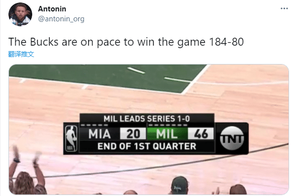球迷Antonin晒雄鹿和热火首节比赛,发推写道:雄鹿正朝着184-84的趋势发展;言外之意就是雄鹿104分大胜热火;美媒晒照恶搞雄鹿打爆热火。
