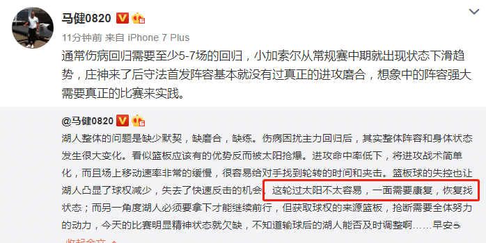 “这轮过太阳不太容易,一面需要康复,恢复找状态;而另一角度湖人必须要拿下才能继续前行,但获取球权的来源篮板,抢断需要全体努力的动力,今天的比赛明显精神状态就欠缺,不知道输球后的湖人能否及时调整啊”。