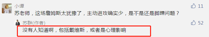 有球迷提问,“苏老师,这场詹姆斯太犹豫了,主动进攻确实少,是不是脚踝问题”,苏群回应,“包括戴维斯,或者是心理影响”。当然,这只是苏群老师的猜测,可能也说到了关键,詹姆斯和浓眉本赛季都经历了多次伤病,他们几乎大部分时间都没从伤病名单中移出来过。