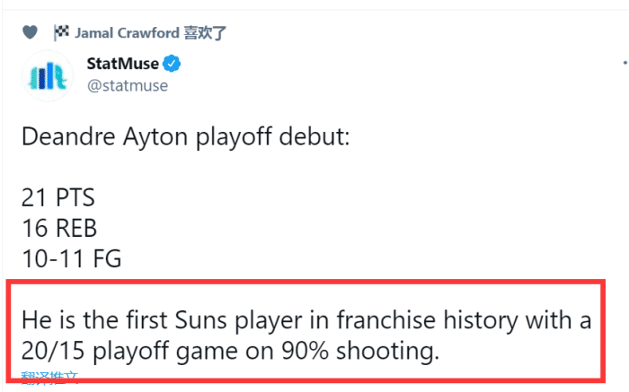 是的,布克和艾顿两人的出色发挥毫无疑问是太阳季后赛开门红的最大功臣。尤其是艾顿这一点,11中10可以说完全打爆了湖人的防守,要知道卫冕冠军常规赛防守效率是全联盟第一,但这个夜晚,湖人对于艾顿完全没有办法。据ESPN统计,艾顿是太阳队史第一位在季后赛首秀砍下20+10的球员!