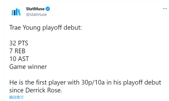 据statmuse统计,特雷杨是罗斯后首个在季后赛首秀砍下至少30分10助攻的球员,玫瑰在09年季后赛首秀狂砍36分11助攻。而巧合的是,这场比赛特雷杨击败的正是罗斯,后者今天16中8也有17分5板5助攻的不错发挥!