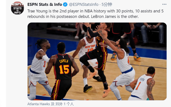 全场比赛,特雷杨23中11狂砍32分7板10助攻,这是他的季后赛首秀,创造了多项里程碑!据ESPN统计,特雷杨是NBA历史第二位在季后赛首秀砍下至少30分10助攻5板的球员,比肩勒布朗詹姆斯!勒布朗在06年季后赛首秀砍下了30+的三双!