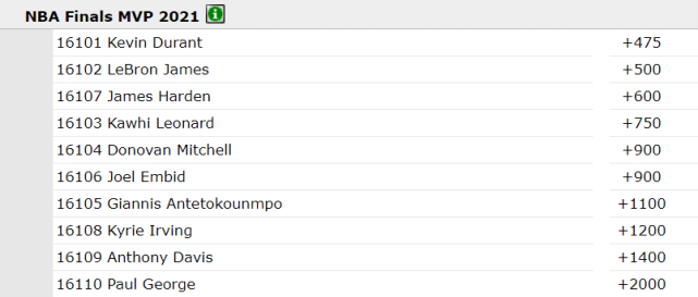 24直播网讯 北京时间5月24日,2020-21赛季的季后赛首轮才刚刚开打,但总决赛MVP的赔率竟然已经出炉!在这份FMVP赔率排名上,一共有32名球员在列。篮网球星杜兰特目前以+475的赔率位居第一,以微弱优势领先湖人球星詹姆斯(+500)。