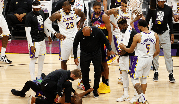 24直播网讯 今天湖人的球迷们一定是最遗憾的,他们的主队在季后赛首战中遗憾的以9分之差输给太阳,无缘季后赛开门红。这场比赛除了胜负之外,最令人关注的要说是詹姆斯险些受伤,末节自己罚球不中准备补篮的时候,起跳却被身旁的保罗给拉拽了胳膊,痛苦倒地之后起身去到场边,表情也很难受。好在詹姆斯没有大碍,赛后他也亲承不会影响到下一场比赛。