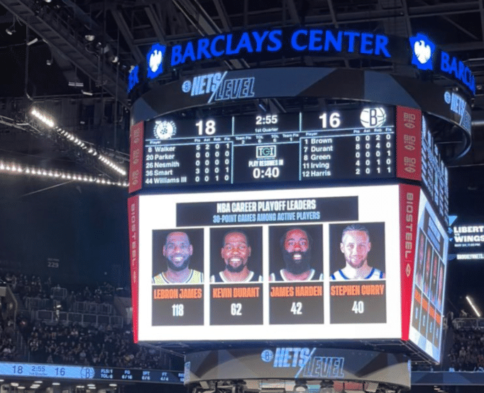 詹姆斯职业生涯已经打了260场季后赛,场均得分28.8分,其中118场30+,杜兰特职业生涯打了140场季后赛,其中63场30+,哈登职业生涯打了128场季后赛,其中42场30+,库里职业生涯攻击打了112场季后赛,其中40场30+。