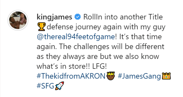 照片上,詹姆斯身穿《空中大灌篮》的黑色T恤,戴着黑色墨镜,显得霸气十足。评论区里,菲尔-汉迪回复道:“兄弟,没错,我们的第6次旅程,目标永不改变@戒指季”。