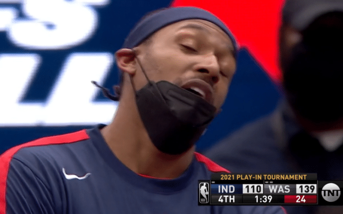 比赛没有结束,奇才已经撤下全部主力。场边奇才主力们也是表情轻松,比尔和队友交流后大笑庆祝。而威少虽然戴着口罩,也难掩笑意。他们做到了几乎不可能做到的事情,因为赛季初,他们是超级弱旅。