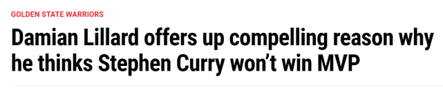 显然,利拉德从库里的身上看到了上赛季的自己。同样是西部8号种子,同样是个人表现出色,他认为应该也会同样无缘最终的常规赛MVP奖项。