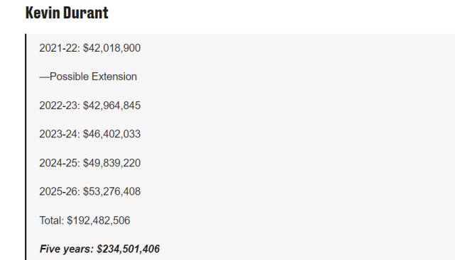 美媒预计杜兰特2021-22赛季后会跳出合同,可以和篮网续签一份4年1.925亿美元的新合同。他的未来5年薪水分布如下图:2021-22赛季4201万美元,2022-23赛季4296万美元,2023-24赛季4640万美元,2024-25赛季4983万美元,2025-26赛季5327万美元。5年总薪水约2.345亿美元。