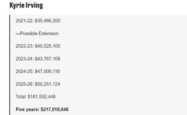 美媒预计欧文2021-22赛季后也跳出合同,可以和篮网续签一份4年1.816亿美元的新合同。他的未来5年薪水分布如下图:2021-22赛季3546万美元,2022-23赛季4052万美元,2023-24赛季4376万美元,2024-25赛季4700万美元,2025-26赛季5025万美元。5年总薪水约2.17亿美元。