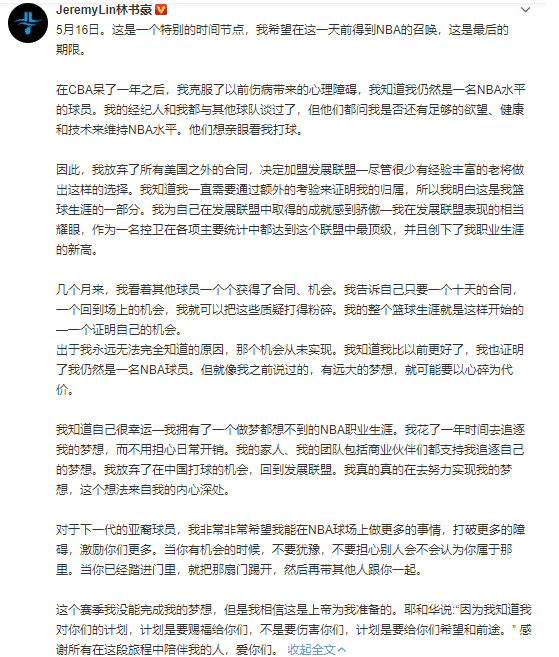 24直播网讯 今天林书豪在社交媒体上的一篇长文吸引了很多人的关注,称自己为了重返NBA,放弃了美国之外的一切合同,而且在发展联盟也打出了不俗的表现,自己只是需要一个证明的机会,哪怕是10天的短合同,一直到常规赛结束,都没有能够实现,林书豪不解为何无法重返NBA。正如他说到的一样,自己的表现比以往更好了,却依旧和NBA无缘了。最后林书豪也感谢了自己在冲击梦想时期一路陪伴的人。
