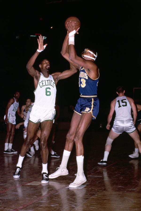 张伯伦的横空出世缓解了大家的审美疲劳,他与拉塞尔的PK从此成为保留曲目。1959年11月7日,波士顿,张伯伦VS拉塞尔第1集上演。那一天,波士顿下起了瓢泼大雨,为巨人对话营造出了足够的江湖意境,门票早就被一抢而光,大家早就迫不及待想看看巨人PK的桥段了。结果,拉塞尔用统治级的防守占得了上风,自己砍下了22分和35分篮板,防得张伯伦只有39投12中,30分和28个篮板。只从数据看,张伯伦不落下风,甚至更为风光,但拉塞尔显然效率更高,而且他的帮手更为靠谱,球队更为强大,那场比赛,凯尔特人队115:106击败勇士队。而这成了两人PK的主题,张伯伦往往能赢得数据,但大多数情况下,赢得胜利的是拉塞尔。该赛季季后赛,凯尔特人队与勇士队再次遭遇,进一步印证了这种论断——