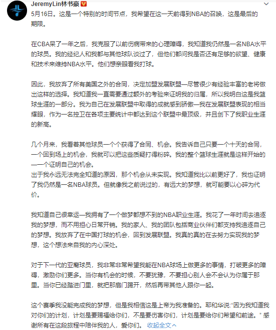 24直播网讯 今天林书豪在社交媒体上发布长文,称本赛季重返NBA的梦想已经破灭了,按照联盟的规定,常规赛结束、季后赛开始前还没有签约,就正式无缘本赛季的NBA了。对于林书豪来说,在发展联盟打了一个赛季,场均19.8分位居第7名,得分榜前11名中只有他没有得到NBA的合同,在长文中林书豪也表示了不理解,他只是想要一份10天的短约,但即便是这样的要求,依旧无法得到满足。