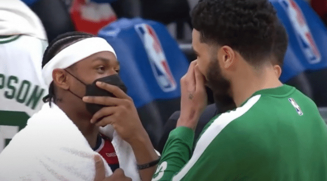 当比尔高中球衣退役的时候,塔图姆还给比尔上台去举球衣了。