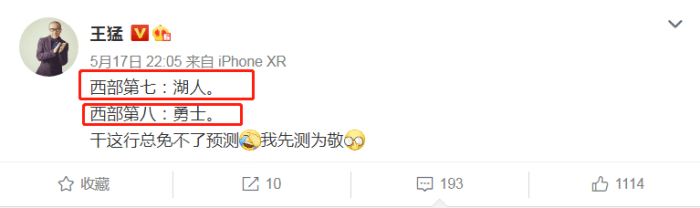 王猛在社媒上写道,“西部第七湖人,西部第八勇士,做这行总免不了预测,我先预测为敬”。可见,王猛老师看好湖人和勇士一起杀入季后赛,而马刺和灰熊将出局。